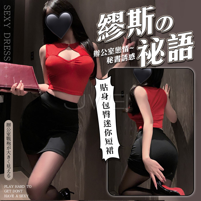 繆斯秘語.胸前挖空露溝貼身包臀超短裙擺秘書裝【T褲+紅上衣+黑裙】