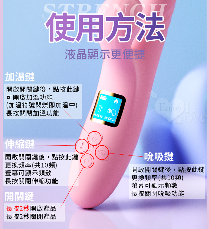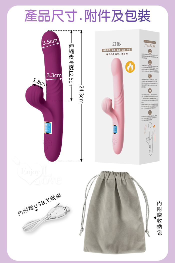 ►您現在的位置:首頁>幻影 ‧ 10頻伸縮抽插X10頻吮吸智能內外夾攻按摩棒﹝加熱恆溫+液晶顯示頻率+USB充電﹞羅蘭紅