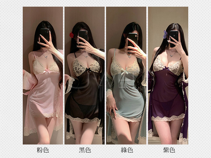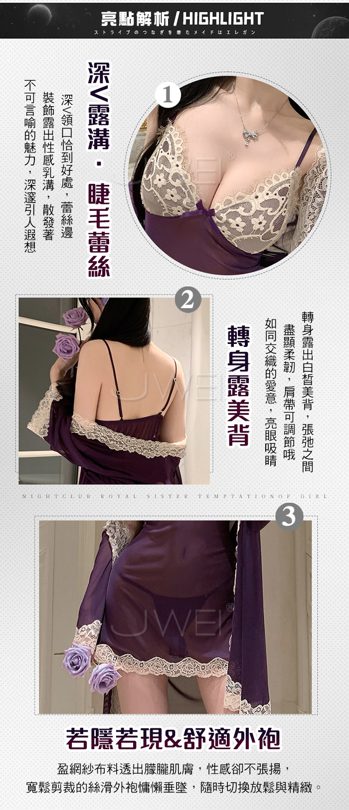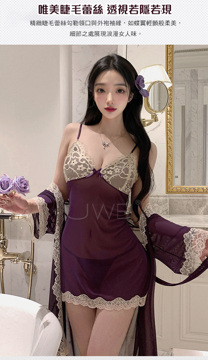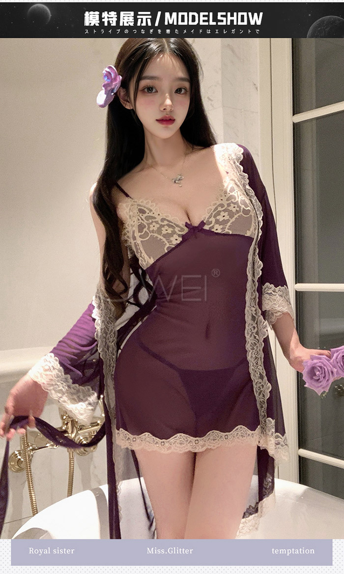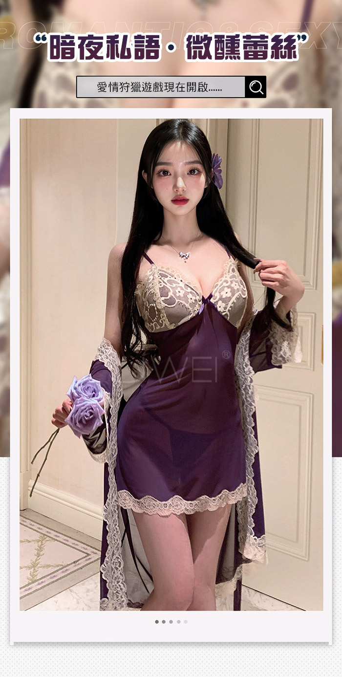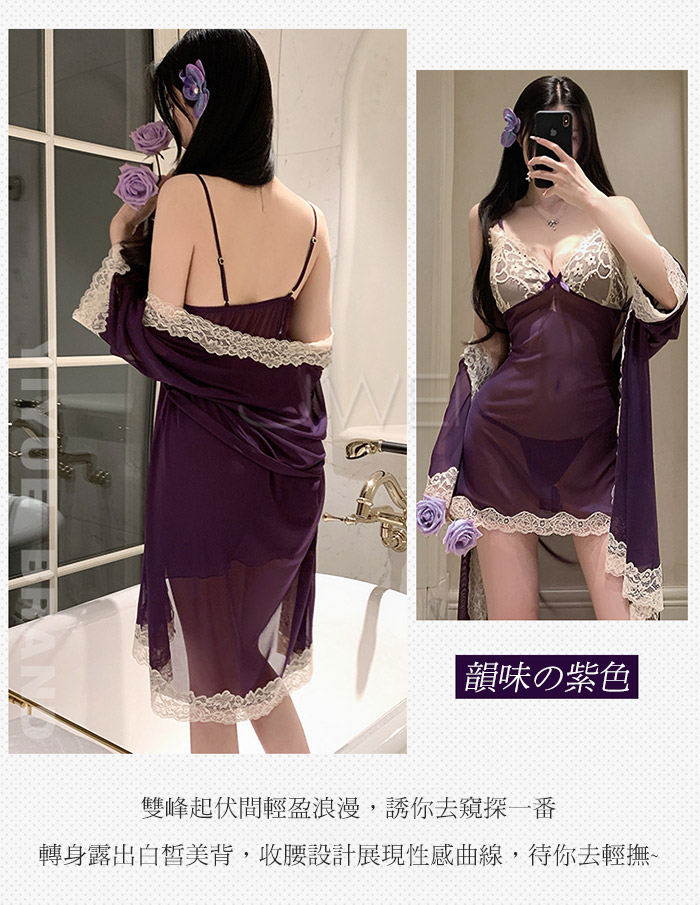首頁>微醺蕾絲.性感深V露溝睫毛蕾絲覆胸美背睡裙-紫色【外袍+睡裙+T褲】