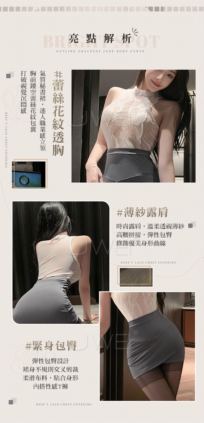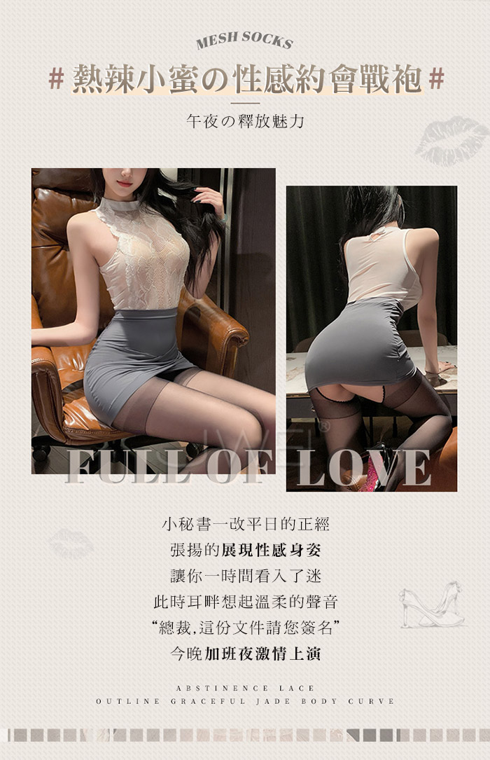 ►您現在的位置:首頁>熱辣小蜜.禁欲蕾絲花紋透胸緊身包臀秘書套裝-灰色【包臀連身裙+T褲】
