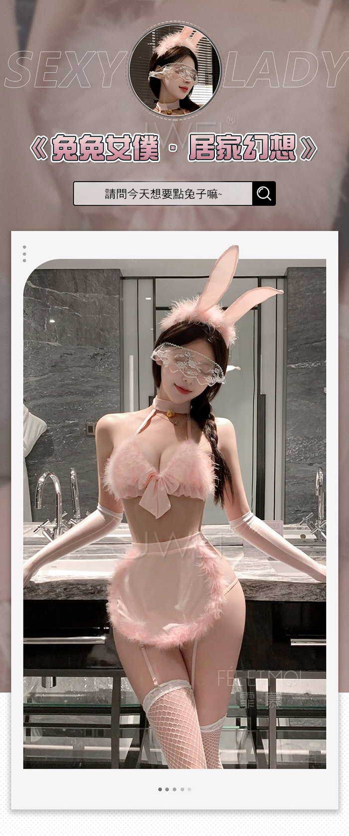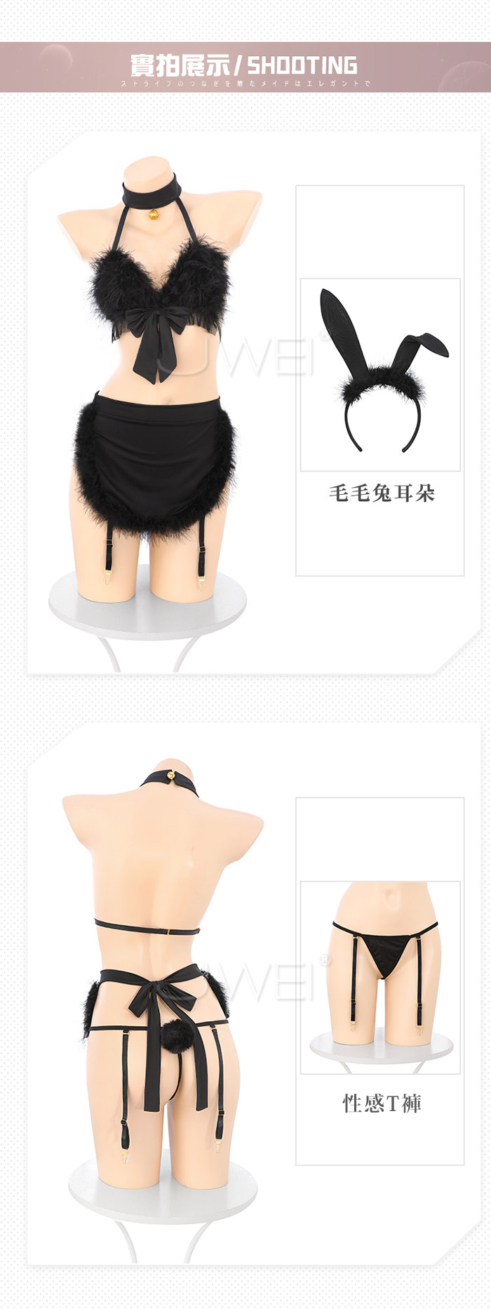 ►您現在的位置:首頁>兔兔女僕.萌感毛絨文胸毛條小圍裙三點式兔女僕套裝-黑色【髮箍+胸罩+圍裙+T褲+可拆卸尾巴+可拆卸吊襪帶*4】