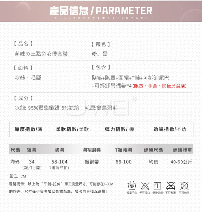 ■內容物:髮箍+胸罩+圍裙+T褲+可拆卸尾巴+可拆卸吊襪帶*4