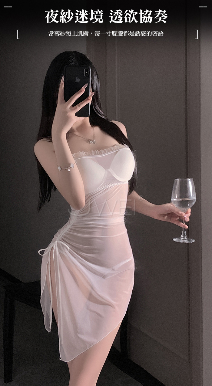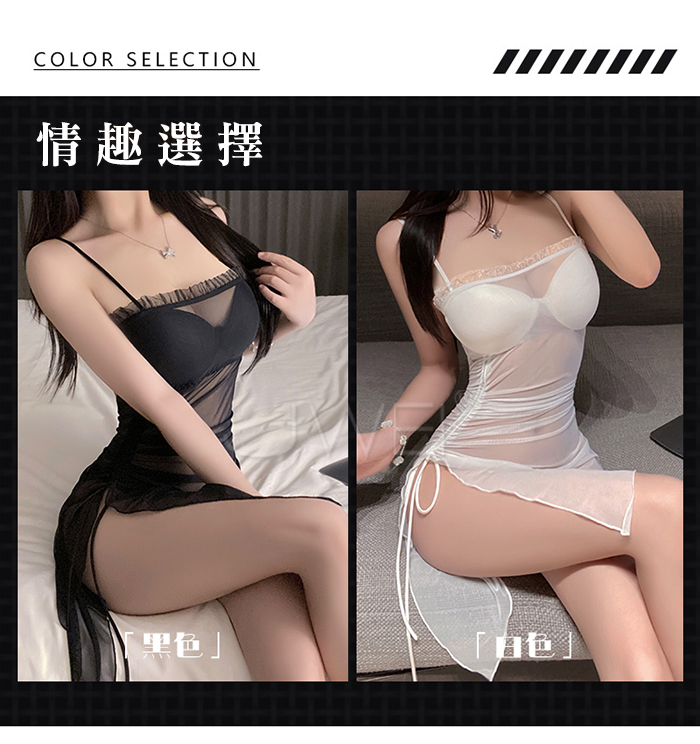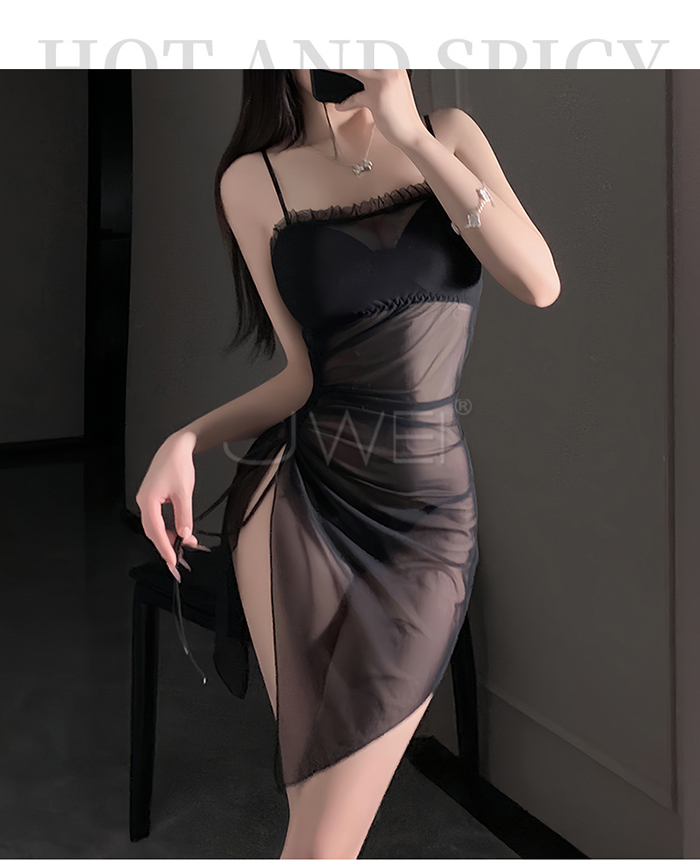 ►您現在的位置:首頁>夜紗迷境.韻味透紗木耳邊飾側開衩抽褶收腰睡裙【睡裙+T褲-黑色】