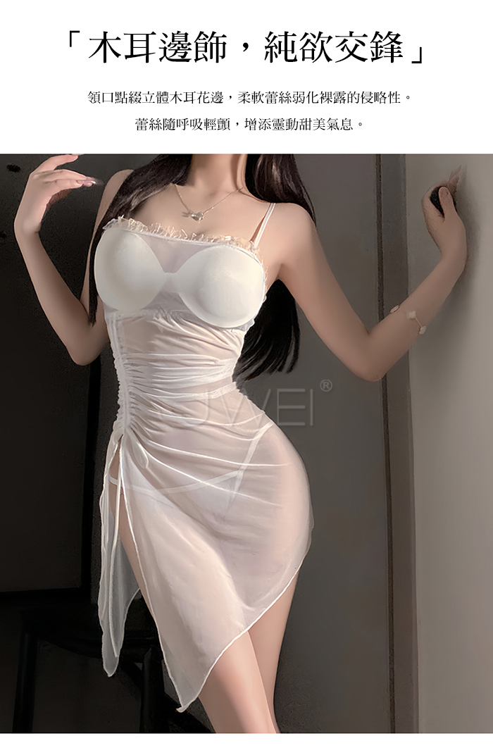 夜紗迷境.韻味透紗木耳邊飾側開衩抽褶收腰睡裙【睡裙+T褲-黑色】