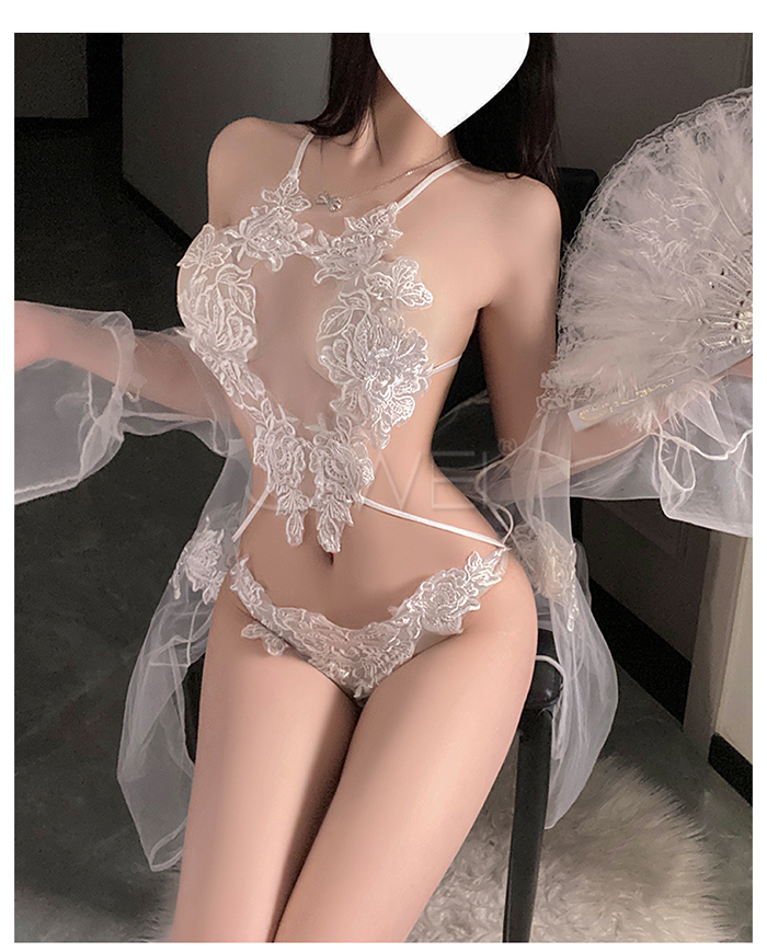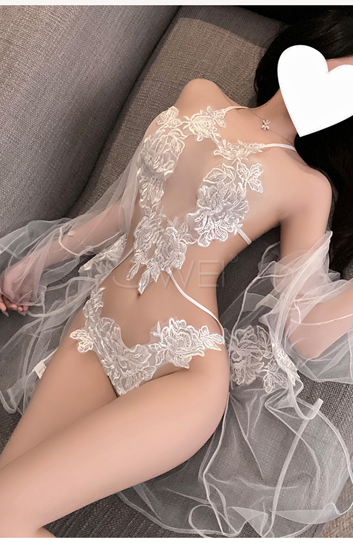 ►您現在的位置:首頁>白夜絮語.純白網紗透膚水溶花蕾絲三點式連體衣【外罩衫+連體三點】